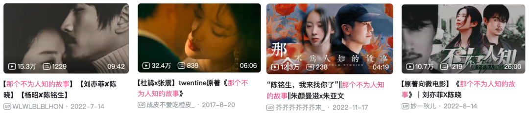 比如大熱IP《那個(gè)不為人知的故事》在B站已有杜鵑/張震、劉亦菲/陳曉,以及朱顏曼滋/朱亞文等多部拉郎剪輯,這在某種程度上甚至?xí)绊懞罄m(xù) IP影視化的選角。