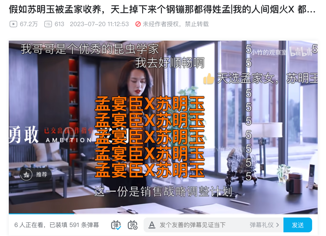 另一種重組劇情式二創(chuàng)則流行于“意難平”類劇集,尤其是與觀眾預(yù)想背道而馳的劇集,比如《我的人間煙火》。由于劇中男女主角人設(shè)觀眾難以理解,在B站上便涌現(xiàn)了大量觀眾自行選角重塑劇情的二創(chuàng)內(nèi)容,比如以《都挺好》中的蘇明玉、《狂飆》中的高啟蘭替代原劇中的許沁,打造觀眾心中的“孟式家族”。