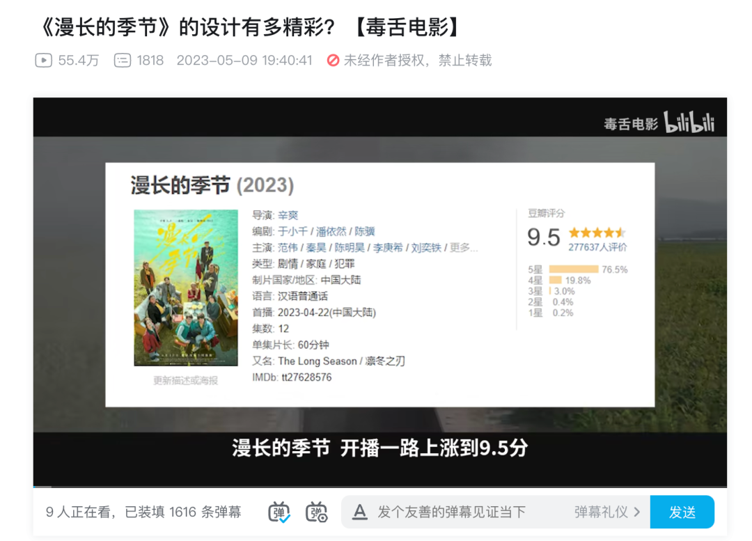 劇集播出后,用戶會(huì)根據(jù)劇情槽點(diǎn)自發(fā)錄制視頻,或進(jìn)行惡搞,傳播量通常較大;內(nèi)容質(zhì)量較好的劇集觀眾則會(huì)圍繞其進(jìn)行解說、拉片。比如《狂飆》《漫長(zhǎng)的季節(jié)》播出后,大量網(wǎng)友從故事文本、鏡頭語言、配樂系統(tǒng)對(duì)其進(jìn)行詳細(xì)解讀,至今仍吸引大量用戶觀看、互動(dòng)。