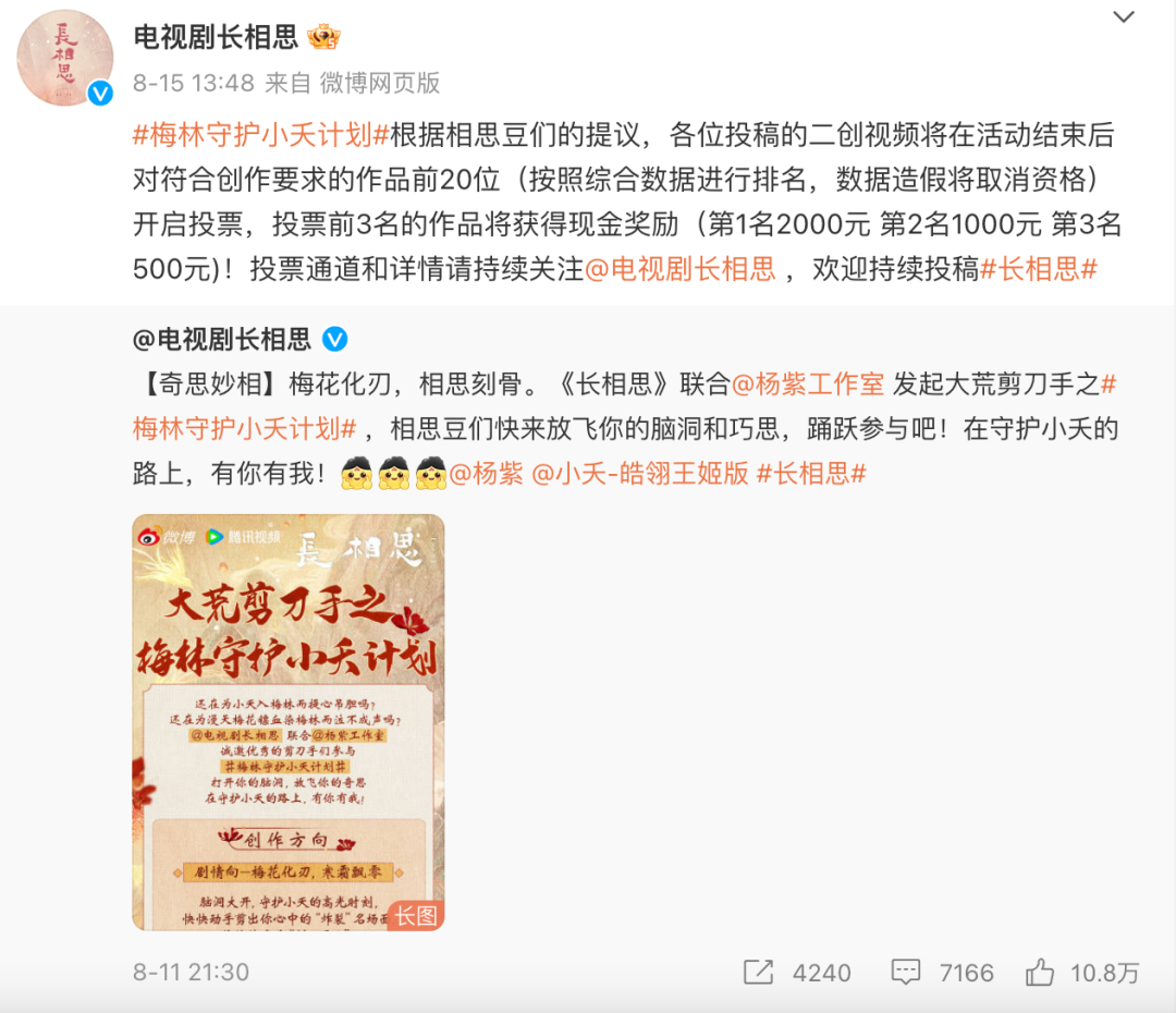 好在《長(zhǎng)相思》夠火,也能夠吸引足夠多優(yōu)秀的剪刀手們?nèi)刖帧4蠼Y(jié)局點(diǎn)映后的第二天,《長(zhǎng)相思》官方順應(yīng)用戶提議,將對(duì)參與二創(chuàng)活動(dòng)的視頻進(jìn)行投票評(píng)選,前三名分別獲得2000元、1000元、500元的現(xiàn)金獎(jiǎng)勵(lì)。至此,這場(chǎng)看起來更像是一場(chǎng)以二創(chuàng)為名的劇集營(yíng)銷活動(dòng)告一段落。
