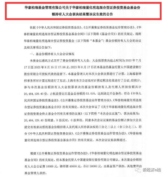 經(jīng)統(tǒng)計,參與本次基金份額持有人大會投票表決的基金份額持有人及代理人所持份額共計2048.41萬份,占權(quán)益登記日基金總份額的53.01%,達到法定開會條件,符合有關(guān)規(guī)定。本次大會審議了《關(guān)于華泰柏瑞量化明選終止基金合同有關(guān)事項的議案》,表決結(jié)果為:2048.41萬份同意,0份反對,0份棄權(quán)。同意本次會議議案的基金份額占參加大會且提交有效表決票的基金份額持有人及代理人所持表決權(quán)的三分之二以上(含三分之二),符合有關(guān)規(guī)定,本次會議議案獲得通過。