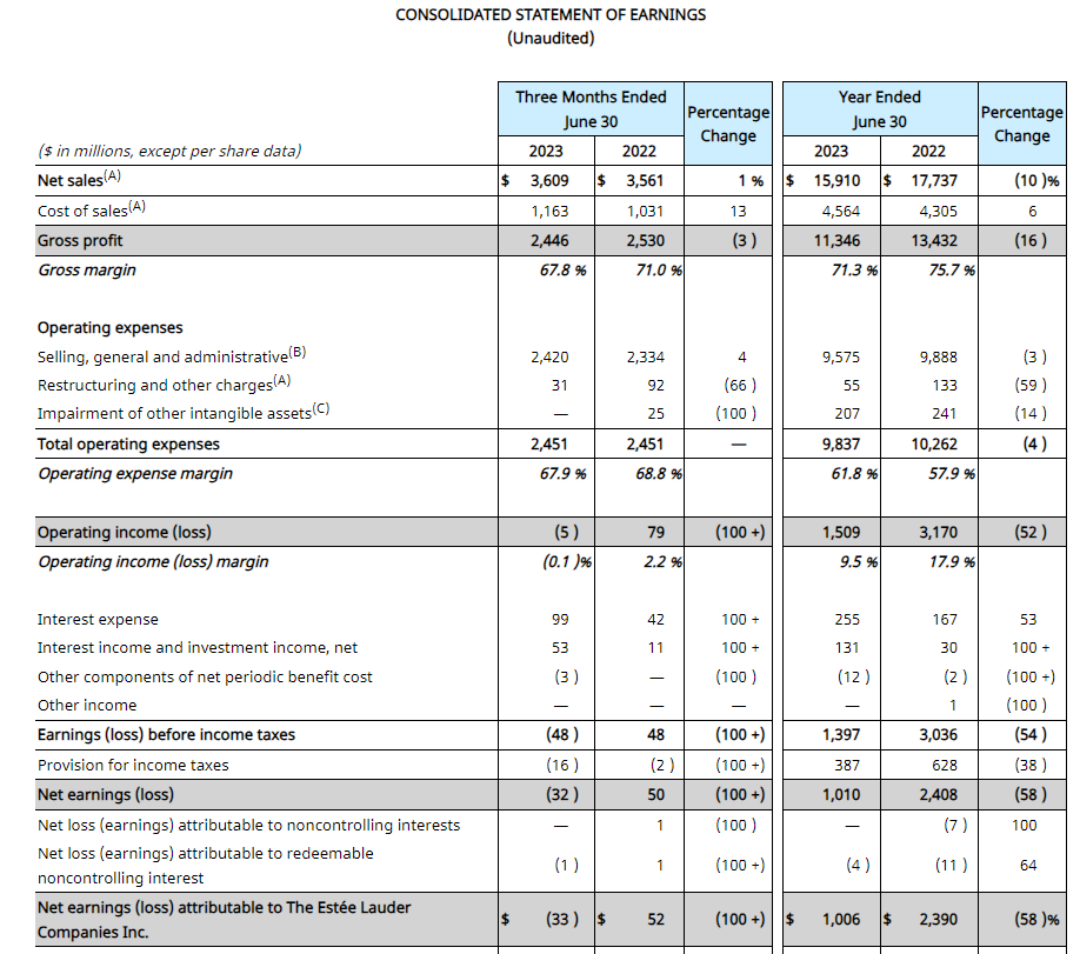 第四季度的凈銷售額恢復(fù)增長至36.1億美元(約合人民幣263.6億元),但增速僅1.4%;且凈虧損達到了3300萬美元(約合人民幣2.41億元),與上年同期的凈利潤5200萬美元(約合人民幣3.80億元)相比,跌幅超過100%,這也是雅詩蘭黛第5個季度(2022年4月1日到2023年6月30日)凈利潤下滑;