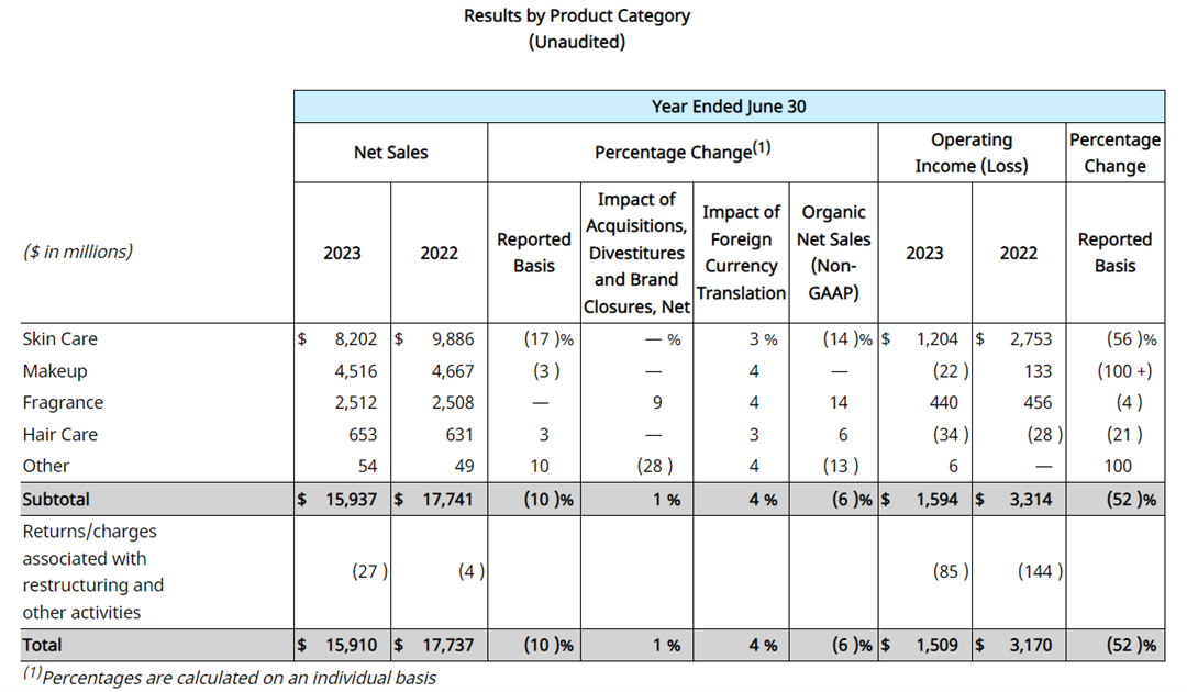 彩妝業(yè)務(wù)的凈銷售額雖然僅下滑了4%,但營業(yè)利潤錄得負增長,跌幅超100%,也是營業(yè)利潤下滑最大的部門。