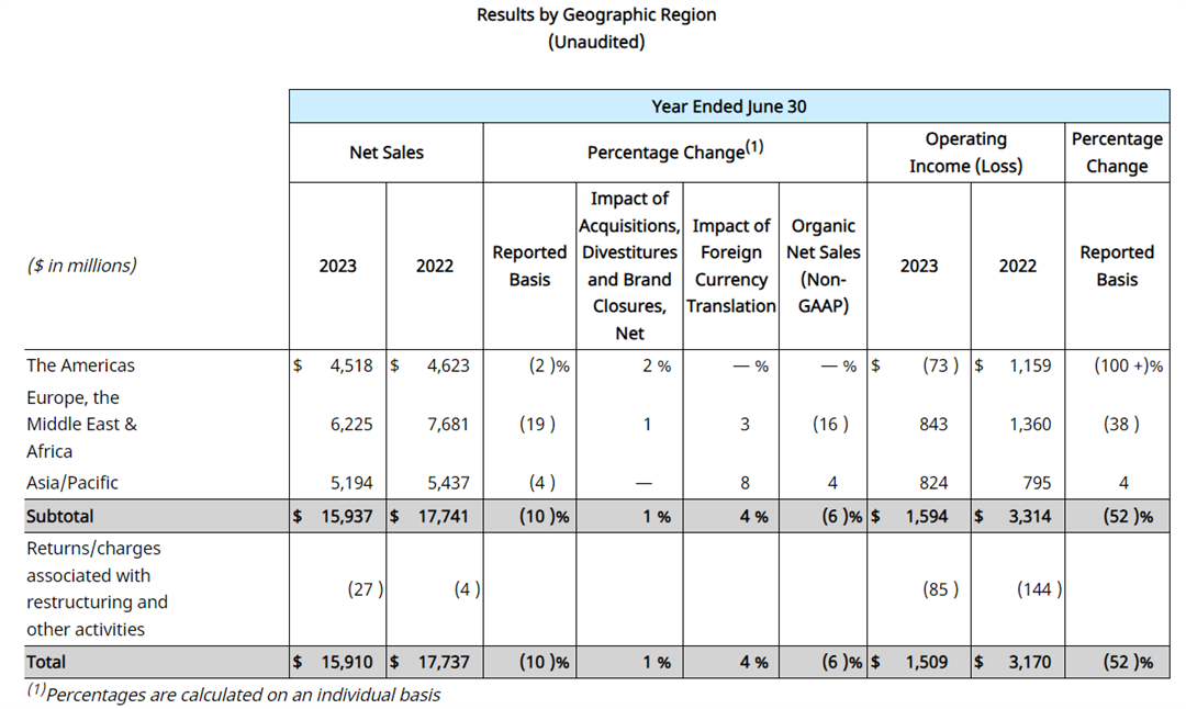 其中,作為業(yè)績貢獻最大的歐洲、中東和非洲地區(qū)下滑最為明顯,凈銷售額從上年同期的76.81億美元(約合人民幣560.9億元)下滑至62.3億美元(約合人民幣455億元),降幅達19%。