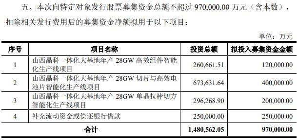 公告顯示,晶科能源擬向不超過(guò)35名特定對(duì)象發(fā)行A股股票,募集資金總額不超過(guò)970,000.00萬(wàn)元(含本數(shù)),扣除發(fā)行費(fèi)用后,擬將12億募資用于山西晶科一體化大基地年產(chǎn)28GW高效組件智能化生產(chǎn)線項(xiàng)目建設(shè)、40億募資用于山西晶科一體化大基地年產(chǎn)28GW切片與高效電池片智能化生產(chǎn)線項(xiàng)目建設(shè)、20億募資用于山西晶科一體化大基地年產(chǎn)28GW單晶拉棒切方智能化生產(chǎn)線項(xiàng)目、25億募資用于補(bǔ)充流動(dòng)資金或償還銀行借款。