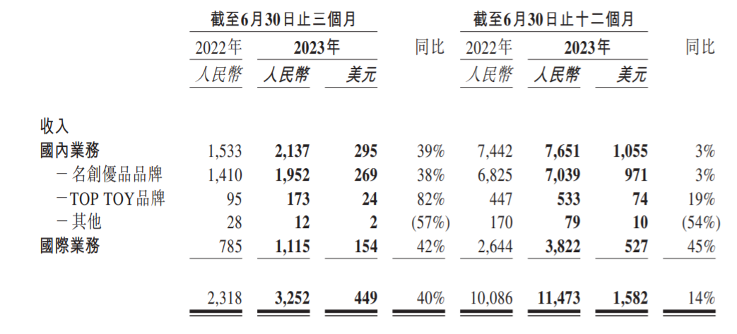 2023年Q2,名創(chuàng)優(yōu)品集團收入為32.52億元,同比增長40.3%;整個2023年上半年,名創(chuàng)優(yōu)品集團的總收入為62.06億元,同比增長33.2%。旗下潮玩品牌TOP TOY在Q2實現(xiàn)營收為人民幣1.73億元,同比增長82%,上半年總營收3.11億,同比增長51%。