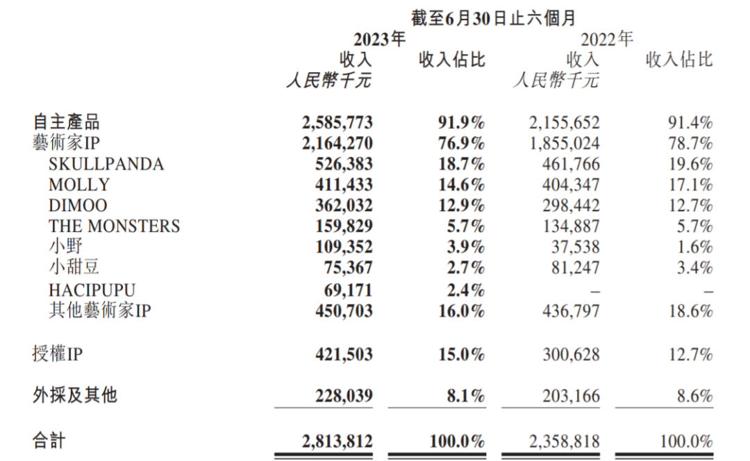 新推出的IP增速較快。2022年下半年推出的HACIPUPU,2023年上半年實現(xiàn)收入人民幣6917.1萬元,設計師團隊PDC(Pop Design Center)推出的小野上半年實現(xiàn)收入1.09億元,同比增長191.3%。