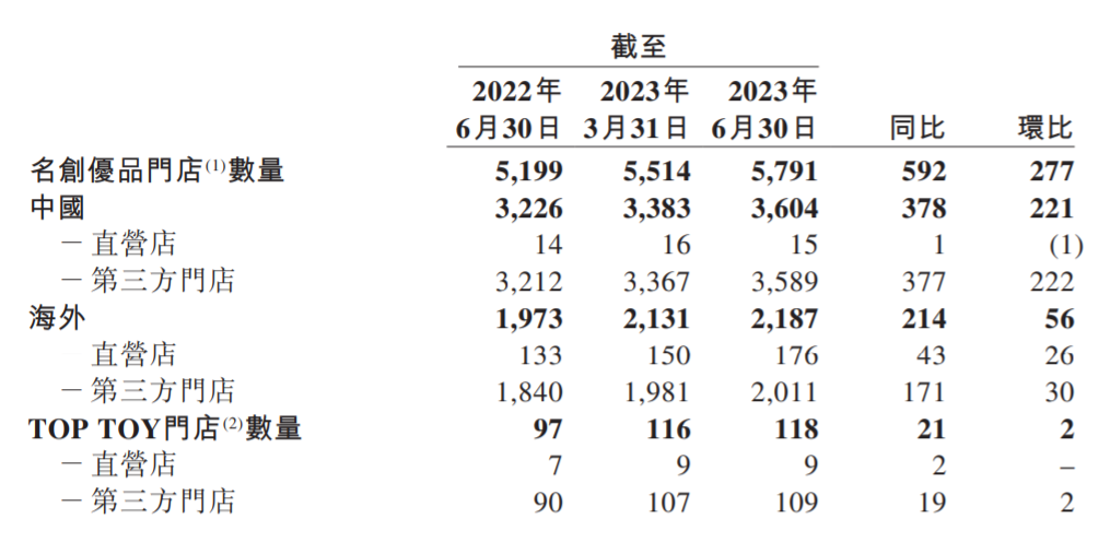 名創(chuàng)優(yōu)品旗下潮玩品牌TOP TOY門店截至2023年6月30日的數(shù)量則為118家,同比增長21家,環(huán)比增加2家。