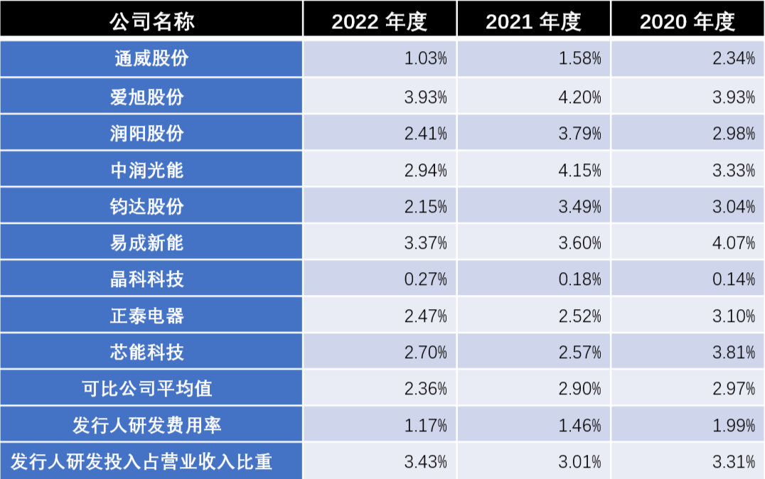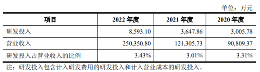 招股說(shuō)明書顯示,2020-2022 年,公司研發(fā)費(fèi)用率為1.99%、1.46%和 1.17%,低于同行業(yè)平均水平。